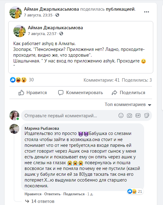 "Издевательство это просто. Бабушка со слезами стояла, чтобы зайти в магазин. Она стоит и не понимает, что от нее требуется. На входе парень ей говорит, что войти можно через Ashyq. Она говорит: "Сынок, у меня есть деньги" — и показывает ему. У нее слезы на глазах, повернулась и пошла, так и не поняла, почему ее не пустили. Бабуле за 80 лет", — поделилась алматинка Марина Рыбакова.