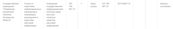 В этом году управление внутренней политики Атырауской области опубликовало тендер на закуп услуг по освещению государственной информационной политики через местные печатные средства массовой информации. На эти нужды было потрачено 357 142 857 тенге.