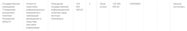 Это не единственный крупный тендер на освещение госполитики через СМИ. На аналогичные нужды в этом же году управление внутренней политики Атырауской области потратило еще 125 миллионов тенге.