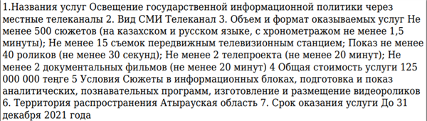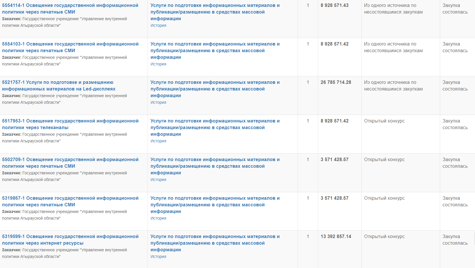 Причем это только самые крупные госзакупки по размещению пропагандистских материалов в СМИ. В действительности таких тендеров гораздо больше. Суммарно за этот год на освещение государственной политики только в Атырауской области уже было потрачено 668 749 994 тенге.
