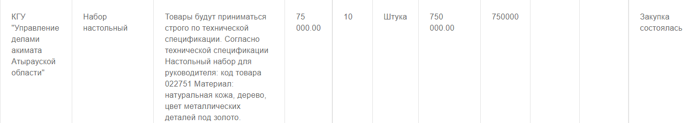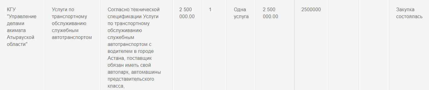 Более скромные, но не менее интересные госзакупки были проведены в управлении делами акимата Атырауской области. Например, в ведомстве приобрели услуги по обслуживанию служебным автотранспортом представительского класса за 2 500 000 тенге.