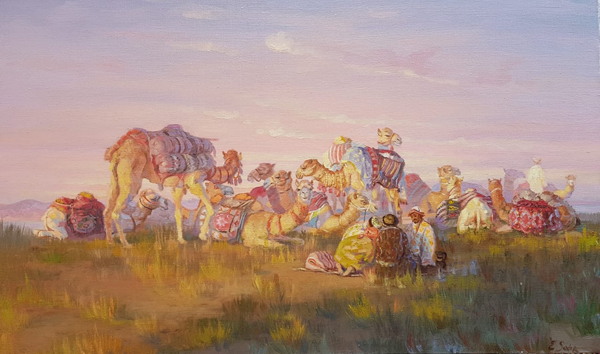Тема Великого Шелкового пути (далее – ВШП) и всего, что с ним связано, уже несколько десятков лет находит особый отклик в сердце художника. Он не просто нарисовал почти сотню картин об этом историческом феномене, но и пошел дальше: начал проводить собственные исследования и в буквальном смысле прошел весь этот путь своими ногами. Этот особенный творческий метод, когда художник углубленно изучает выбранную тему, лег в основу написания всех его исторических картин. Благодаря чему, безусловно, возникает особо доверительное общение со зрителем.