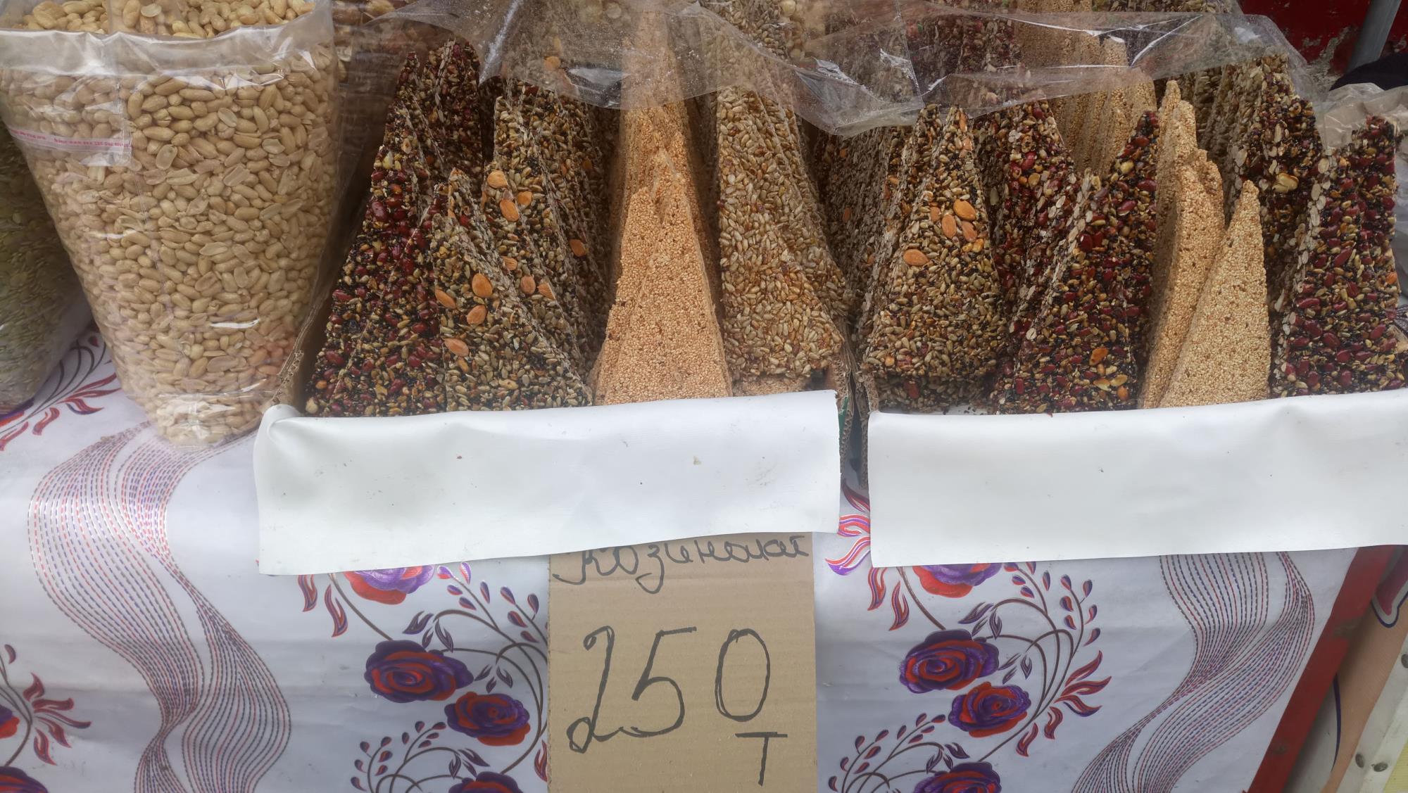 У продавщицы сладостями Алмы — свои елки. Только они съедобные и сделаны из семечек, орехов, изюма, кунжута, пшена, кураги… Несколько лет женщина сама делает и продает козинаки. Штучка в виде треугольной елочки стоит 250 тенге. Я купила, попробовала — вкусно.