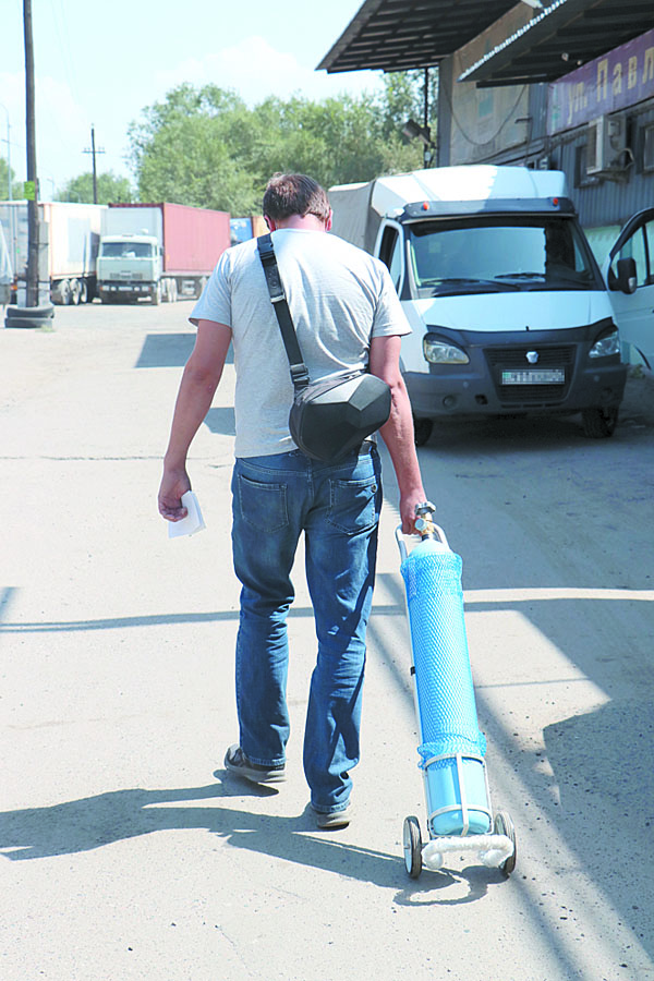 У покупателя аж лицо перекосило от беспомощности. Его место тут же занимают еще двое других, тоже со своими баллонами.