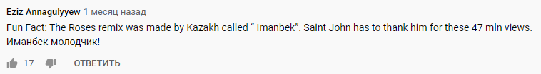 Не так давно в СМИ появилась информация, что рэпер из США Saint Jhn (Карлос Сент-Джон) поблагодарил Иманбека за его ремикс на песню "Roses". Американский музыкант пояснил, что казахстанец дал произведению "совершенно новую жизнь". Он записал видеообращение, где рассказал о работе казахстанца.