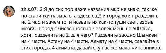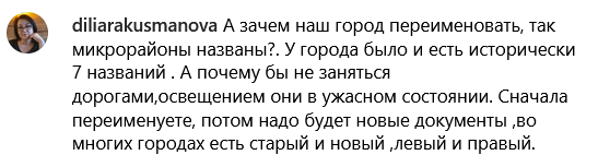 Таразцы остались недовольны ситуацией. Они считают, что в городе есть более насущеные проблемы, например, ремонт освещения и уборка мусора, а также отмечают, что предложенные названия уже закреплены за микрорайонами, селами и другими объектами в Таразе и рядом с ним, что приведет к путанице.
