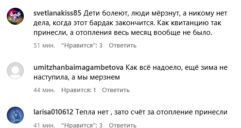 «Мы — жители города Сарань, микрорайон 1а, дом 1. Весь октябрь нет тепла. Писали и мастеру, и акиму, ссылается на замену котлов, потом якобы некому работать… А квитанции за октябрь принесли, сделали перерасчет за 3 дня, это в тот период, когда они меняли котлы. Это сейчас им работать некому, а что будет в минус 20? Всё размерзнется! Ходили в эту котельную в 10 вечера, там только один рабочий на 4 котла, а толку — как были холодные батареи, так и остались. Сидим на обогревателях. Это мне за тепло заплати и за свет!» — так подписано видео из котельной.