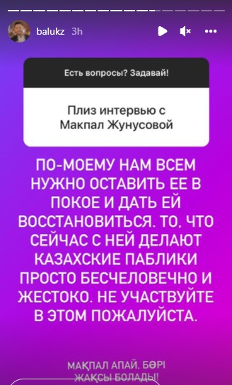 Балымбетова попросили об интервью с Макпал Жунусовой, и он высказал своё мнение о её ситуации: "По-моему, нам всем нужно оставить её в покое и дать ей восстановиться. То, что сейчас с ней делают казахские паблики, просто бесчеловечно и жестоко. Не участвуйте в этом, пожалуйста".
