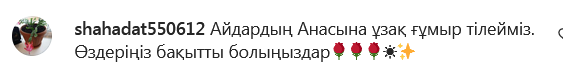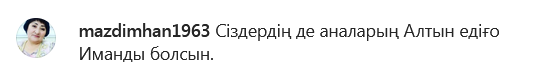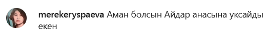 "Это мать моего брата Айдара из группы "Жігіттер". Мать — это очень хорошо. Дай Аллах ей долгих лет жизни. Увидев нас, она очень обрадовалась и заключила нас в горячие объятия. Я почувствовал хотя бы немного материнской доброты и будто увидел свою маму. Наши с Бейбит матери ушли в мир иной, и потому нам всегда хочется порадовать чужих матерей, когда видим их. Тем более она воспитала такого сына казахского народа, как Айдар. Будьте здоровы», — написал артист.