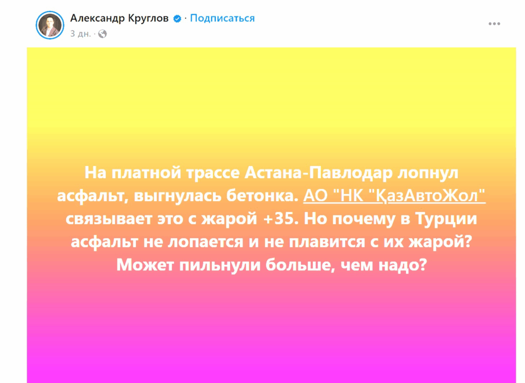 Кусок трассы поднялся на 1265 км автодороги «Астана – Шидерты – Павлодар – Успенка – граница РФ (п/п Косак)» в направлении столицы и создал опасность для водителей. В «КазАвтоЖоле» списали всё на жару.