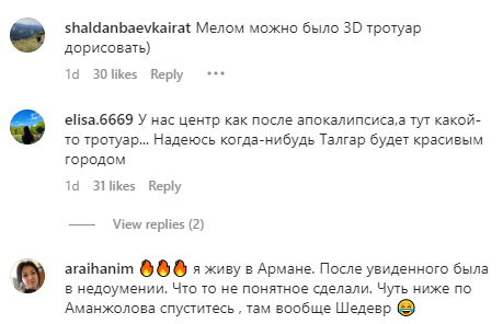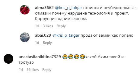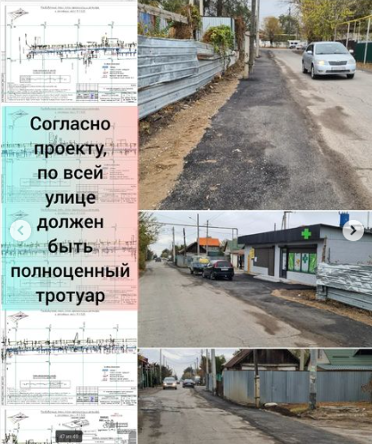 Также указано, что в акимате отреагировали такими словами: "В соответствии с решением технического совещания по ул.Аманжолова со стороны ул.Конева было принято тех.решение расширить асфальтное покрытие дороги. При том, что в том месте участок под тротуар по ширине местами узкий и там же расположены заборы (ограждения) на частной территории, что в свою очередь создает препятствия. По этой основной причине проложить тротуар на указанном участке технически не представляется возможным. Также было принято решение, что материалы, которые не были использованы на том участке, будут использованы на других участках путем исключить-добавить".