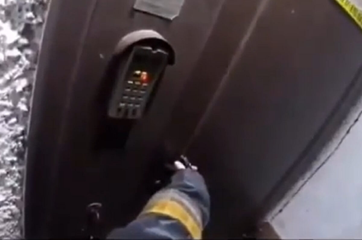 На кадрах ролика мужчина в форме пожарного подходит к домофону и набирает номер квартиры, чтобы войти в подъезд, откуда поступил вызов о пожаре в квартире.