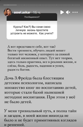 "Курсы? Как? Вы сами свою личную жизнь устроить не можете. Как учите?" — спросили у неё подписчики, и Аскар прикрепила свой ответ: