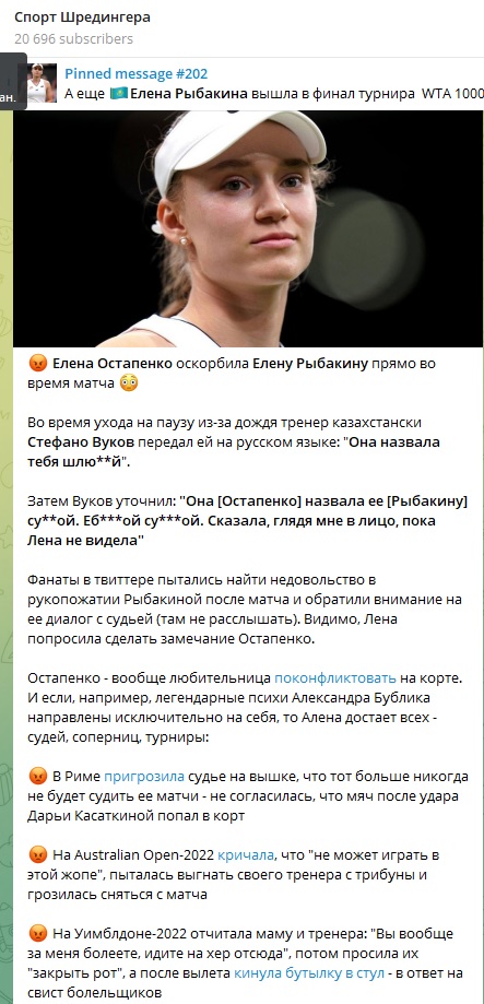 Ранее телеграм-канал «Спорт Шредингера» рассказывал, как во время полуфинального матча турнира WTA 1000 в Риме, в момент перерыва из-за дождя тренер Рыбакиной Стефано Вуков передал ей на русском языке слова Остапенко: «Она назвала тебя шлю**й».