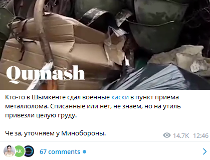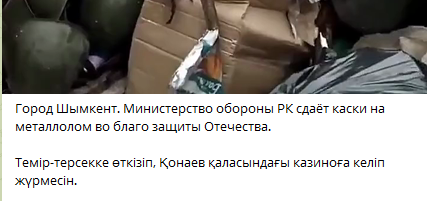 На видео показывают гору военных касок и сообщают, что это одна из шымкентских свалок.