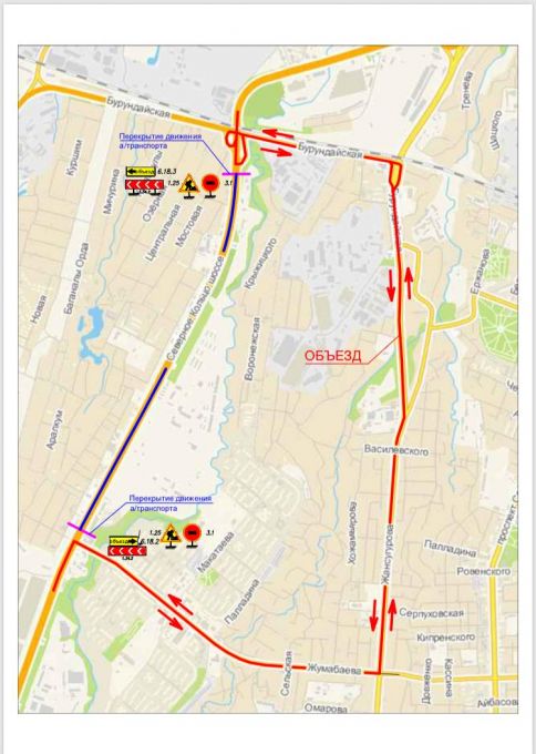 "В связи с производством работ по монтажу пролетного строения надземных пешеходных переходов по ул. Северное кольцо – севернее ул. Жумабаева (мечеть "Карасу") с 23.00 час. 16 октября до 6.00 час. 17 октября, а также по ул. Северное Кольцо – южнее ул. Бурундайской (АЗС "Карасу") с 23.00 час. 17 октября до 6.00 час. 18 октября движение автотранспорта по ул. Северное кольцо от ул. Жумабаева до ул. Бурундайской в северном и южном направлениях будет временно перекрыто ", — сообщили в Управлении городской мобильности Алматы.