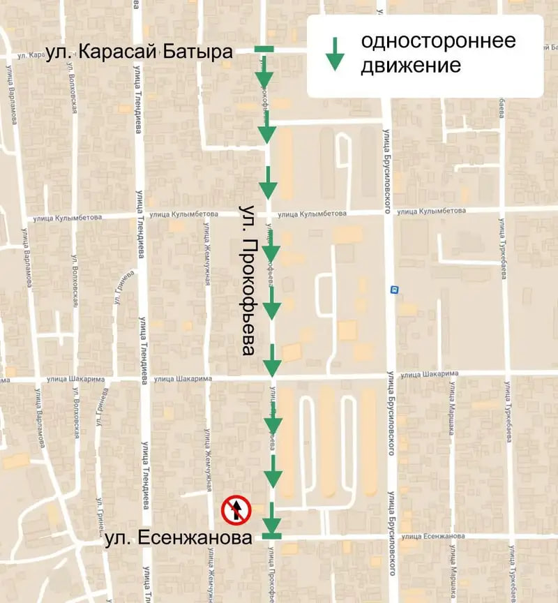 В управлении городской мобильности рассказали, что с 23 августа в экспериментальном виде вносятся изменения в схему дорожного движения путем организации одностороннего движения в южном направлении от ул. Карасай батыра до ул. Есенжанова. На участке установят соответствующие дорожные знаки.