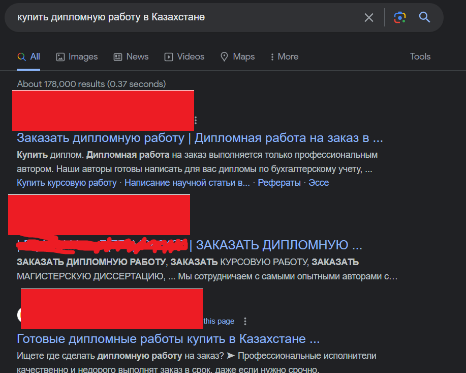 При помощи запроса в поисковике: "купить дипломную работу в Казахстане" мы получили 178 тыс. результатов: