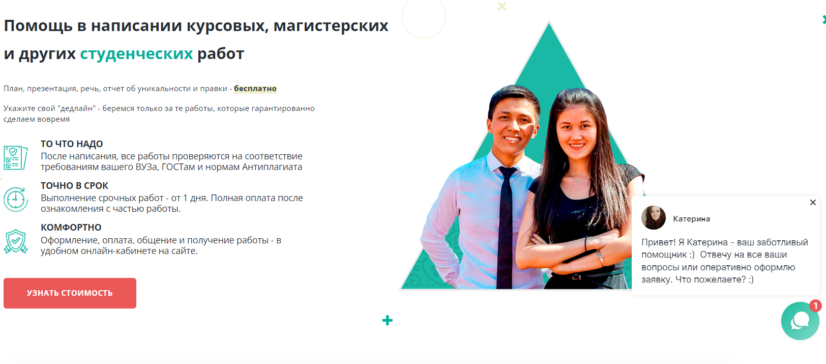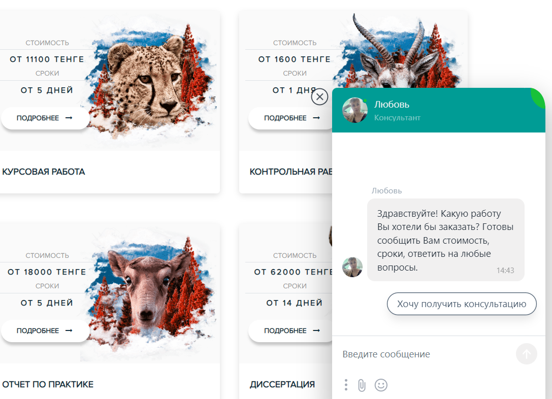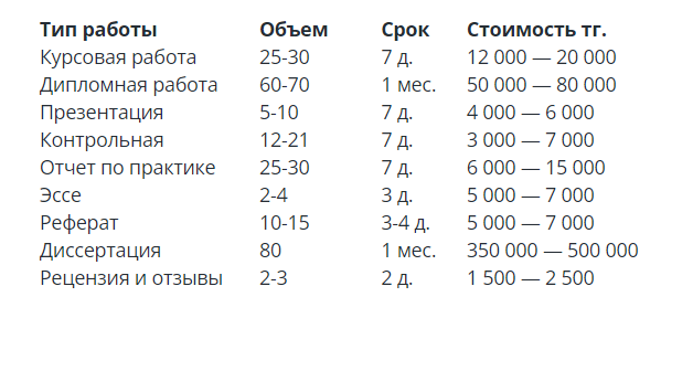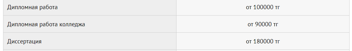 На другом сайте информации по срокам и страницам в открытом доступе нет, каждый вариант нужно индивидуально высчитывать на калькуляторе. Дипломная стоит от 100 тыс. тенге, диссертация — от 180 тыс. тенге.