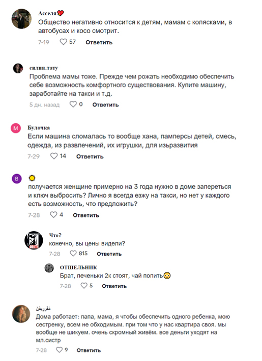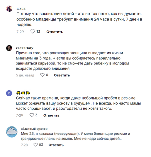 Напомним, что два года назад Казахстанский институт общественного развития проводил массовое анкетирование в Казахстане, в результате чего выяснил, что 7,6 % опрошенных семей не хотели иметь детей. То есть, несмотря на высокие показатели рождаемости в Казахстане, чайлдфри у нас есть. И, судя по комментариям в TikTok, их может быть гораздо больше, чем указано в анкетировании. Какие же доводы приводят молодые люди, которые не готовы сейчас заводить детей?