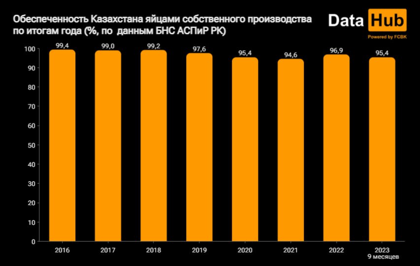 "Короткий ответ – нет. Яйца относится к числу базовых продуктов питания, которыми Казахстан хорошо обеспечивает себя сам. Причем как минимум в последние 7 лет. Судите сами: по итогам 9 месяцев доля производства в ресурсах составила 95,4 %. Средний уровень 2016-2022 гг. – 97,4 %. Впрочем, это не означает, что дела обстоят лучше некуда. В октябре и ноябре яйца сильно выросли в цене – на 5,5 % и 5,6 % соответственно. Но тут, скорее всего, дело в сезонности", — говорится в сообщении.