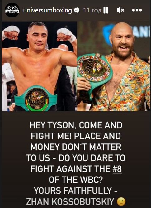 "Эй, Тайсон, выходи драться со мной! Место и деньги не имеют значения. Осмелишься ли ты подраться с восьмым в рейтинге WBC? Искренне твой, Жан Кособуцкий", — говорится в пиар-сообщении Universum Boxing, представляющей казахстанца.