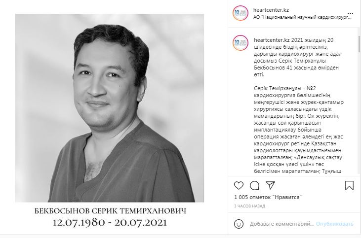 — Серик Бекбосынов был заведующим отделением кардиохирургии № 2 и одним из лучших специалистов в области сердечно-сосудистой хирургии. Коллеги и пациенты любили и уважали его за доброту и профессионализм, — сообщили в Национальном научном кардиохирургическом центре.