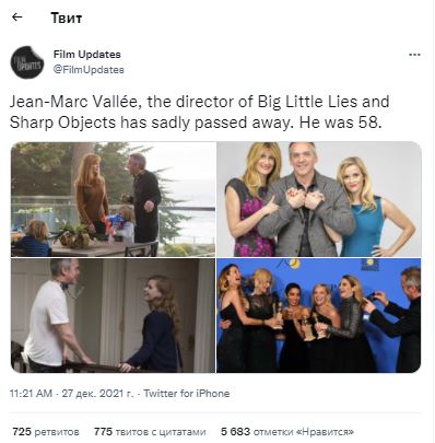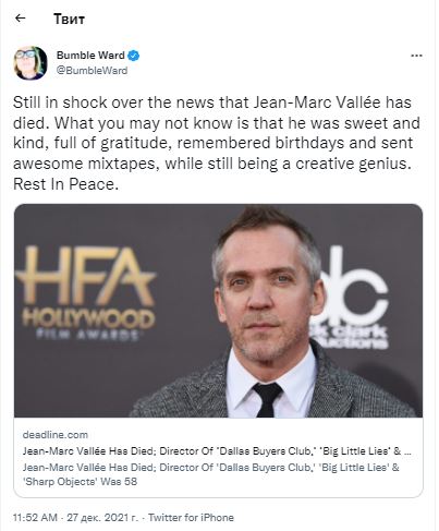 О кончине режиссера впервые сообщил сайт Deadline, позже весть подтвердила представитель Жан-Марка Валле на своей странице в Twitter, передает Tengrinews.kz со ссылкой на Reuters.