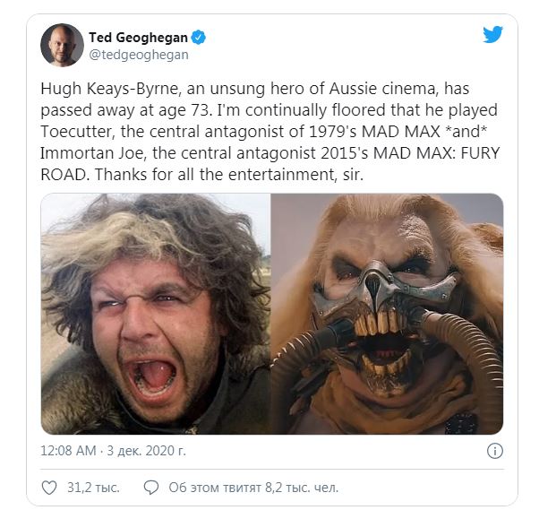 — Хью Кейс-Берн, невоспетый герой австралийского кинематографа, скончался в возрасте 73 лет. Я неизменно поражен тем, что он сыграл главного антагониста – Потрошителя – в фильме "Безумный Макс" 1979 года и основного антагониста "Безумный Макс: Дорога Ярости" в 2015 году – Несмертного Джо, – написал Гейган.