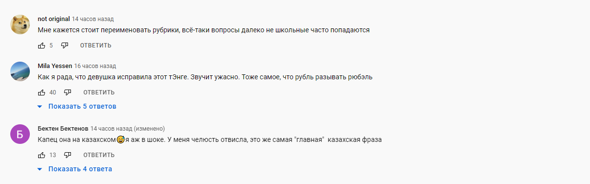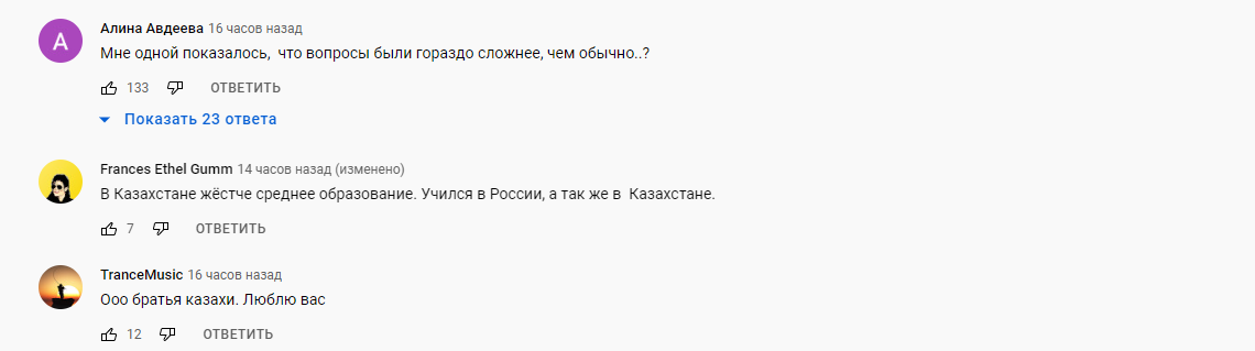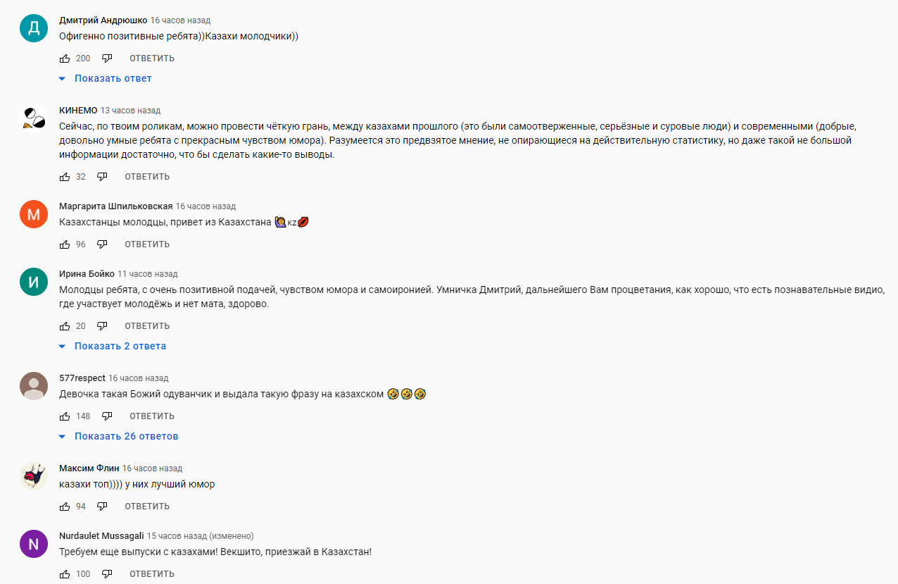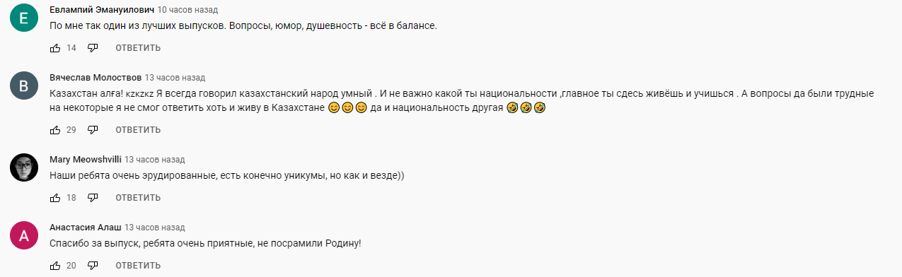 К слову, похожий ролик на этом же канале выходил в январе, и тогда российские пользователи были приятно удивлены эрудированостью наших ребят. "Очень приятно, что казахская молодежь прекрасно владеет русским": казахи оказались умнее россиян и восхитили пользователей Youtube
