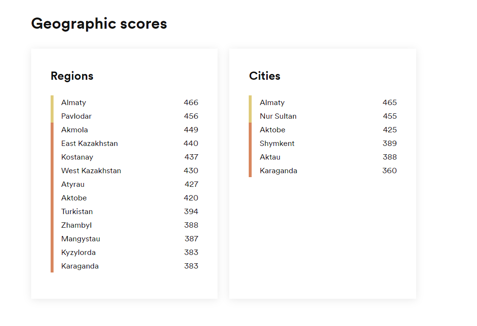Если же взглянуть на показатели отдельных регионов РК, то тут заметен довольно большой разброс. В лидерах оказался Алматы – 465 баллов. Следом расположились Павлодарская область – 456, Астана – 455, Акмолинская область – 449, ВКО – 440, Костанайская область – 437. На юге показатели значительно хуже: Туркестанская область – 394, Шымкент – 389, Жамбылская область – 388, Кызылординская область – 383. Очень низок уровень владения также в Мангистау и в Карагандинской области – 387 и 383 соответственно.