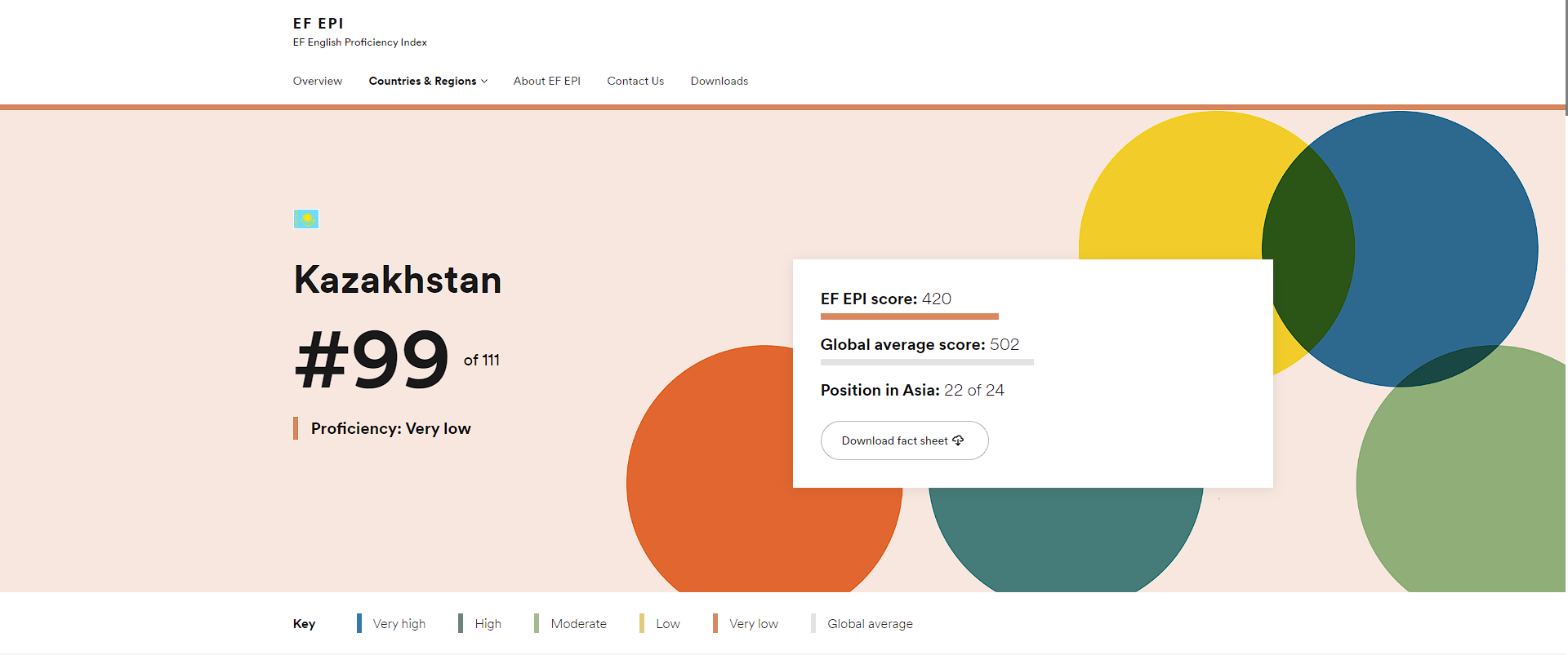 «Исследования и рейтинги по уровню владения английским в разных странах публикуются ежегодно, и позиции Казахстана, к сожалению, скатываются все ниже и ниже. Так вышло и в этот раз с Education First, где мы заняли позорное 99-е место среди 111.