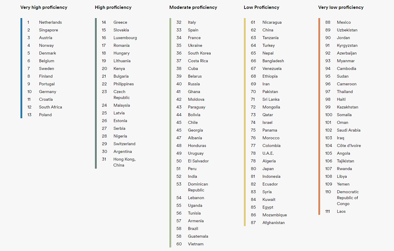 При этом в рейтинг не включены англоговорящие Великобритания, США, Канада, Австралия, Новая Зеландия, Ирландия и некоторые другие страны.