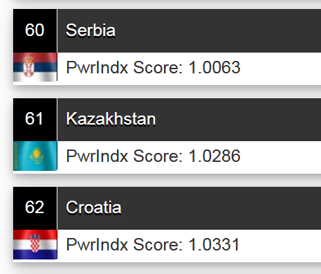Эту строчку мы получили в основном благодаря большой площади и добыче полезных ископаемых. Не удалось подняться выше из-за почти десятка факторов, связанных с флотом, — количеством подлодок, авианосцев и т.д. По этим показателям Казахстан занимает 139-е место из 140 стран.