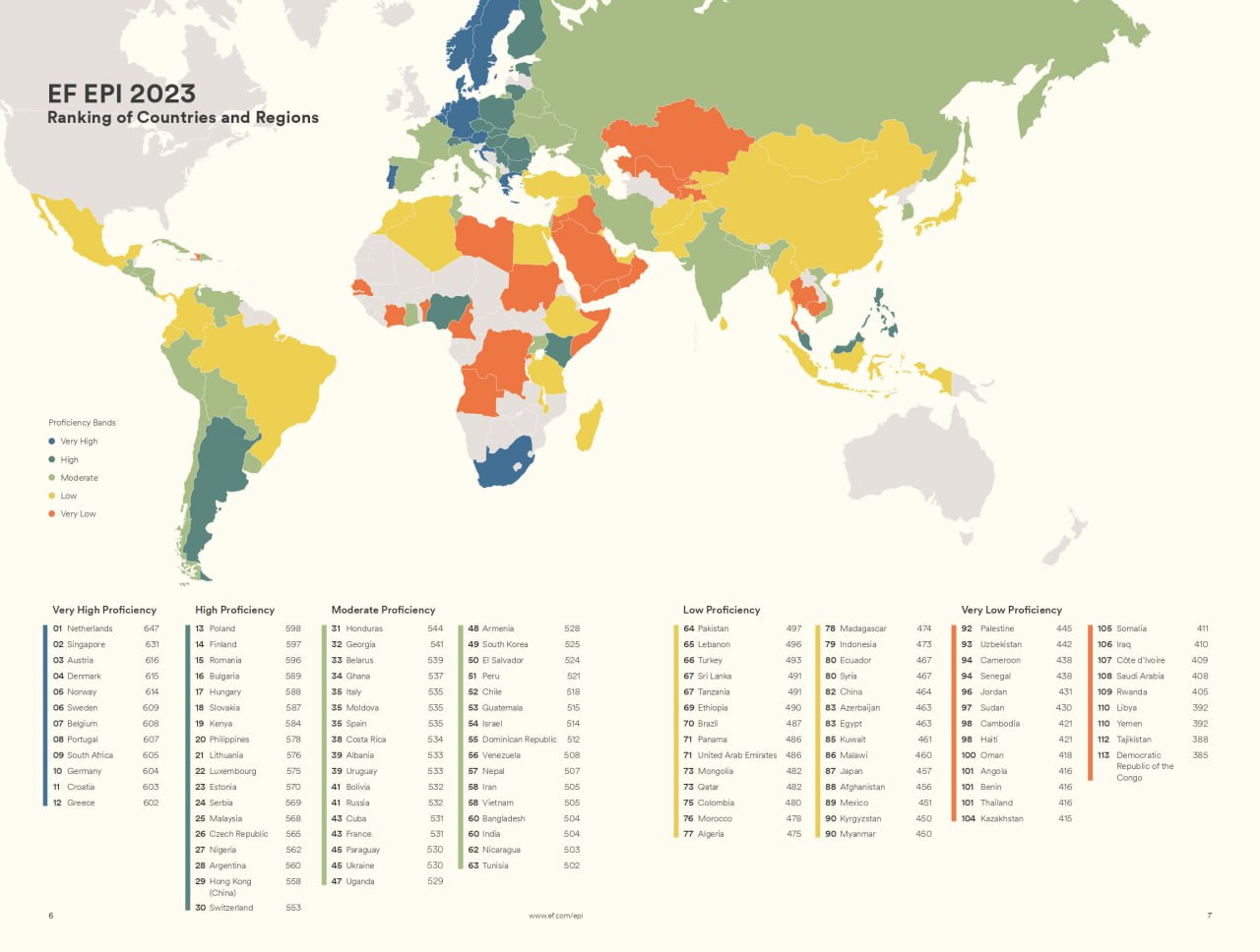 Рейтинг сформирован на основе результатов тестирования 2,2 миллионов респондентов в 113 странах и регионах, которые в зависимости от уровня владения английским разделены на категории следующим образом: