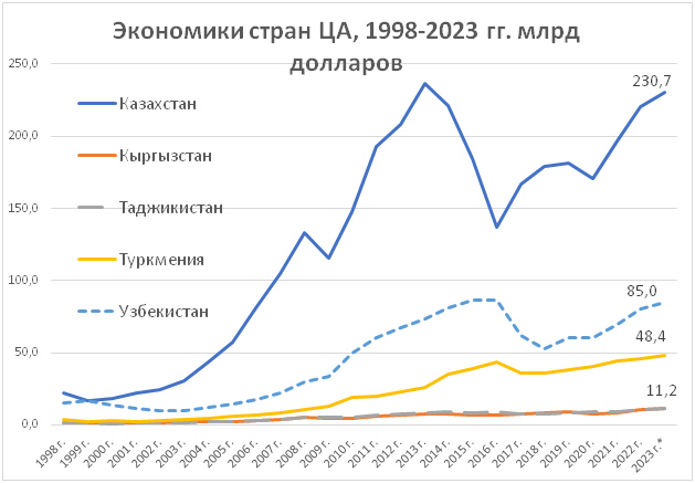 Этот график показывает динамику роста экономик стран Центральной Азии. Формально и в пересчете на доллары экономика Казахстана больше, чем все экономики региона вместе взятые. В сравнении с ВВП Узбекистана экономика Казахстана больше в три раза.