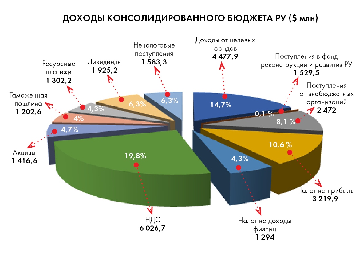 Бюджет Узбекистана скроен иначе. Шесть крупнейших источников (НДС + Доходы от целевых фондов + Налог на прибыль + Дивиденды + Поступления от внебюджетных организаций + Неналоговые поступления) дадут две трети дохода.