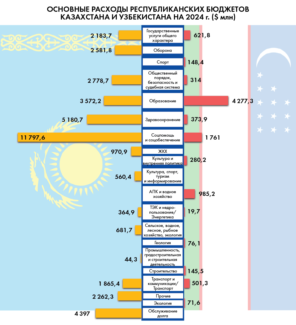 На развитие транспорта, на градостроительство, на промышленность и село – все то, что сейчас объявлено перспективными секторами экономики — уходит меньше 6 %. Примерно столько страна тратит на полицию и суды. Это сильно разнится с тем, на что тратят деньги узбеки.