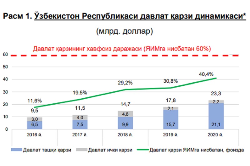Согласно закону республики о госбюджете на 2021 год сумма государственного долга, привлеченного от имени Узбекистана и под его гарантии, не должна превышать 60% по отношению к годовым прогнозам показателям ВВП. Такой уровень считается безопасным.