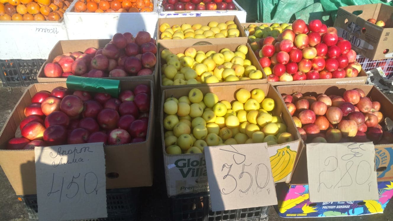 Выбор овощей здесь хороший, со слов продавцов, товар в основном идет из Узбекистана, Китая, из разных регионов Казахстана. В среднем цены на фрукты-овощи такие: капуста — 250, свекла — 300, тыква — 350, лук — 250, редька — 300, мандарины — 550-600, виноград — 850-1300, яблоки — 350, помидоры — 850, горько-сладкий и сладкий перец — 1500 за килограмм.