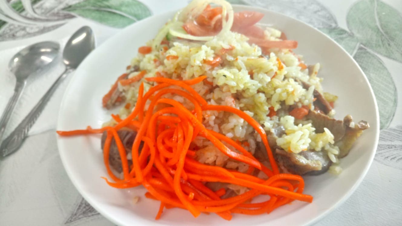 «Тамақ, тамақ», — зазывает на обед сотрудница кафе. Внутри скромно, но чисто. В обеденное время посетителей мало. Вспомнила, как пару лет назад не могли с подругой найти свободные места, чтобы пообедать — все кафе, шашлычные, донерные были переполнены. Заказываю плов с салатом (1500 тенге) и стакан чая. С обслуживанием обед выходит в 2000 тенге.