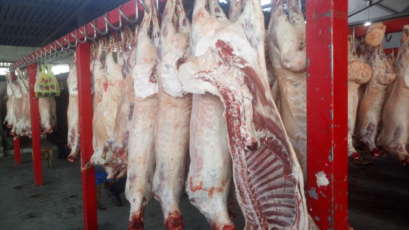 В оптовом отделе висят мясные туши, но и здесь очереди не стоят. Оптовая цена на молодую баранину (пол-туши) – 2400 тенге.