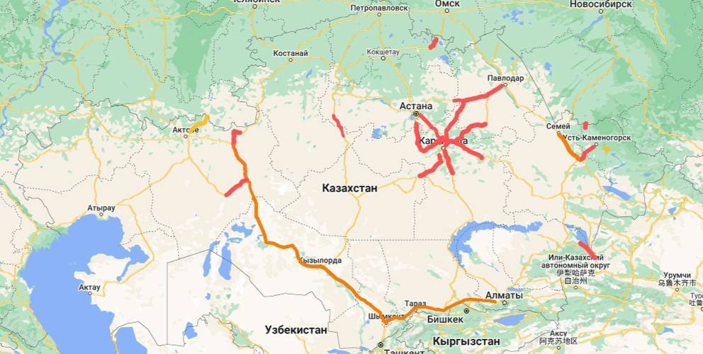 - Восточно-Казахстанская область – 4 участка (231 км)