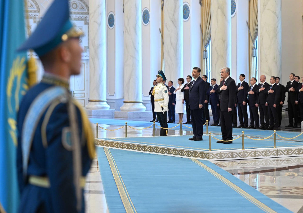 Президент Касым-Жомарт Токаев лично встретил кортеж председателя КНР Си Цзиньпина. В честь высокого гостя перед президентским дворцом пролетели истребители Сил воздушной обороны Республики Казахстан, оставив за собой красный и желтый след – цвета флага Китая.