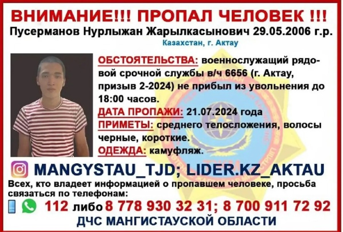 По данным «LIDER.KZ» и ДЧС региона, в Актау без вести пропал 18-летний солдат-срочник Нурлыжан Пусерманов.