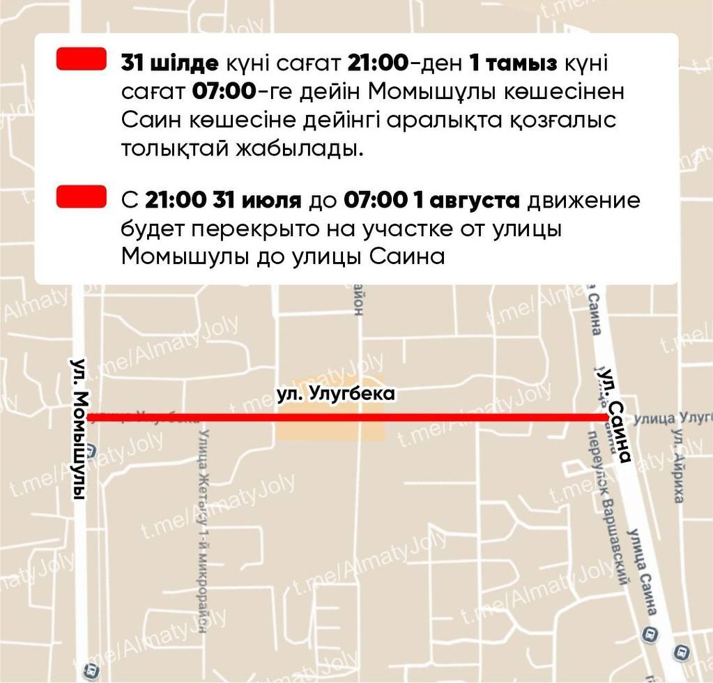 С 21:00 31 июля до 07:00 1 августа движение будет перекрыто на участке от улицы Момышулы до улицы Саина.