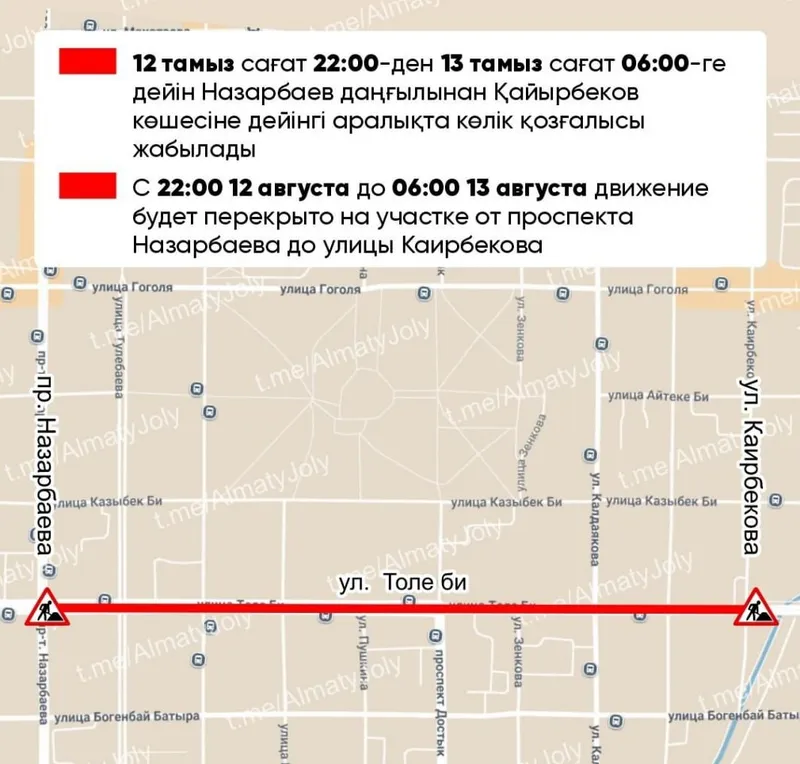 С 22:00 12 августа до 06:00 13 августа движение перекроют на участке от пр. Назарбаева до ул. Каирбекова.