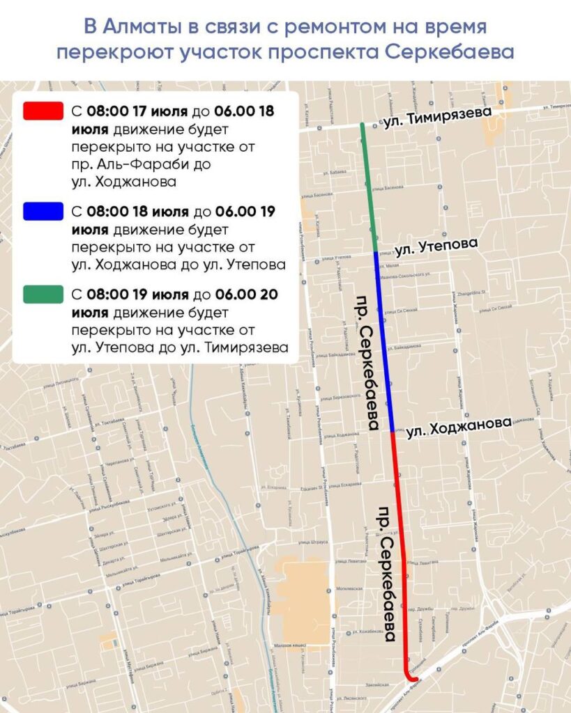 С 08:00 17 июля до 06:00 18 июля ограничат движение между проспектами Аль-Фараби и Ходжанова. В 08:00 18 июля перекроют участок между улицами Ходжанова и Утепова – тоже на 22 часа. С 08:00 19 июля на такое же время перекроют проезд между улицами Утепова и Тимирязева.