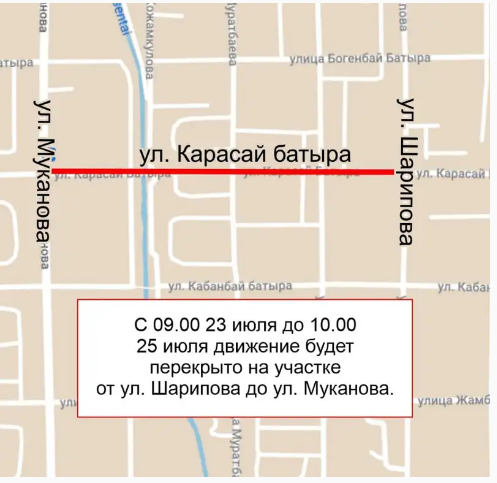— С 09:00 23 июля до 10:00 25 июля движение будет перекрыто на участке от ул. Шарипова до ул. Муканова, – следует из сообщения, опубликованного в Telegram-канале Almaty_Joly, пишет Caravan.kz