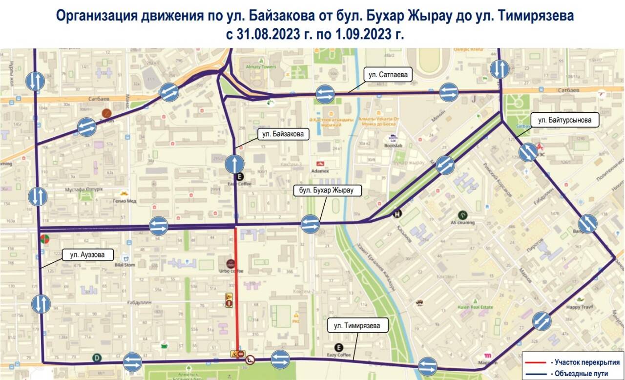 С 23:00 31 августа до 6:00 1 сентября по ул. Байзакова от бул. Бухар Жырау до ул. Тимирязева будет проводиться средний ремонт дорожного покрытия с полным перекрытием движения.